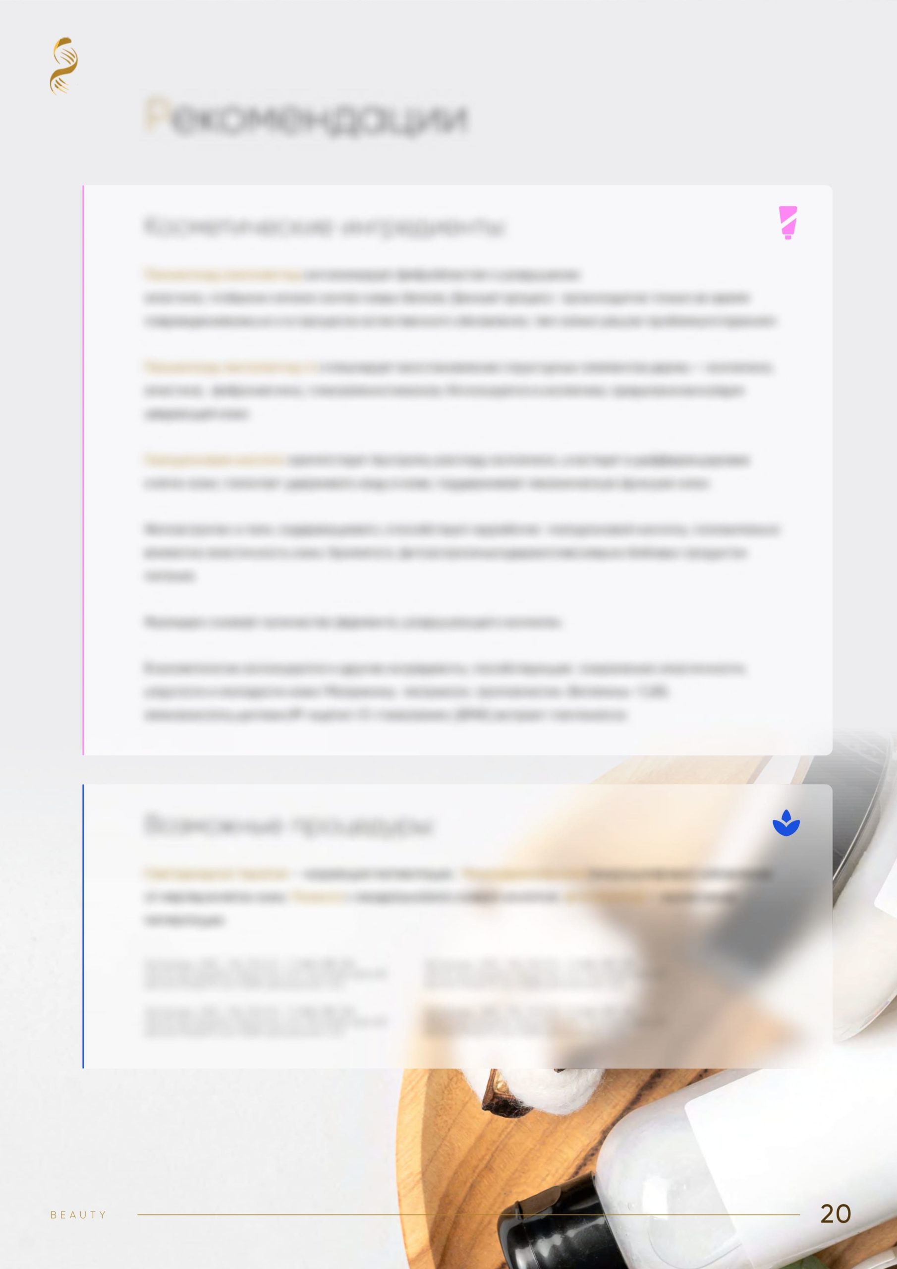 - Рекомендации по косметологическим процедурам (можно ли делать пилинги, какие выбрать филлеры, эффективны ли для вас инъекции гиалуроновой кислоты и мезотерапия).