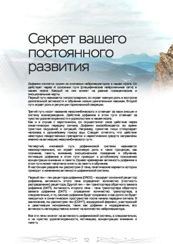 Этот ДНК анализ показывает влияние наиболее важных 10 генов на психическое и эмоциональное состояние. Именно они регулируют выработку гормонов, работу нейромедиаторов. Используйте знания о природных свойствах своего организма для борьбы со стрессом, повышения работоспособности и общего тонуса. Каждый человек индивидуален, поэтому мы рекомендуем пройти наш генетический нейро тест в Шелехове.